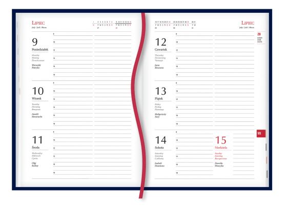 Format: A5 Rodzaj papieru: offset 70g/m2 biały Układ kalendarium: 1 tydzień - 2 strony Ilość stron: 144 Druk: 2 kolory Wklejka: mapa administracyjna Polski i polityczna Europy Oprawa: zintegrowana, okładka kartonowa, barwna foliowana, jedna tasiemka