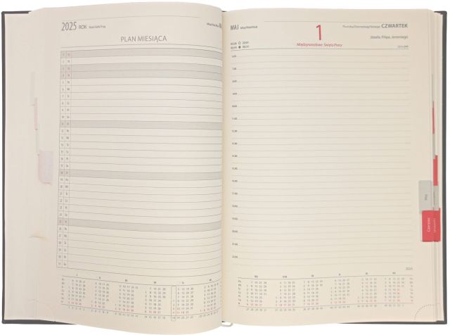 Kalendarz dzienny biznesowy w sztywnej oprawie z okleiną skóropodobną, okładka z gąbką, jednokolorowa z ozdobnymi przeszyciami - jeden dzień na jednej stronie. Registry typu U-90°, perforacja do odrywania narożników. Przydatne informacje np. dla kierowców oraz miejsce na notatki i dane adresowe. Papier koloru chamois 448 stron. Format 215x295 mm.
