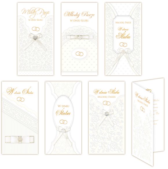 Laurka z okazji ślubu format DL w saszetce Satynowy złocony lakier wybiórczy, tłoczenia, kompozycje ze złotej folii W środku tekst życzeń, białe koperty Saszetki ozdobione kokardka z dżetem lub perełką