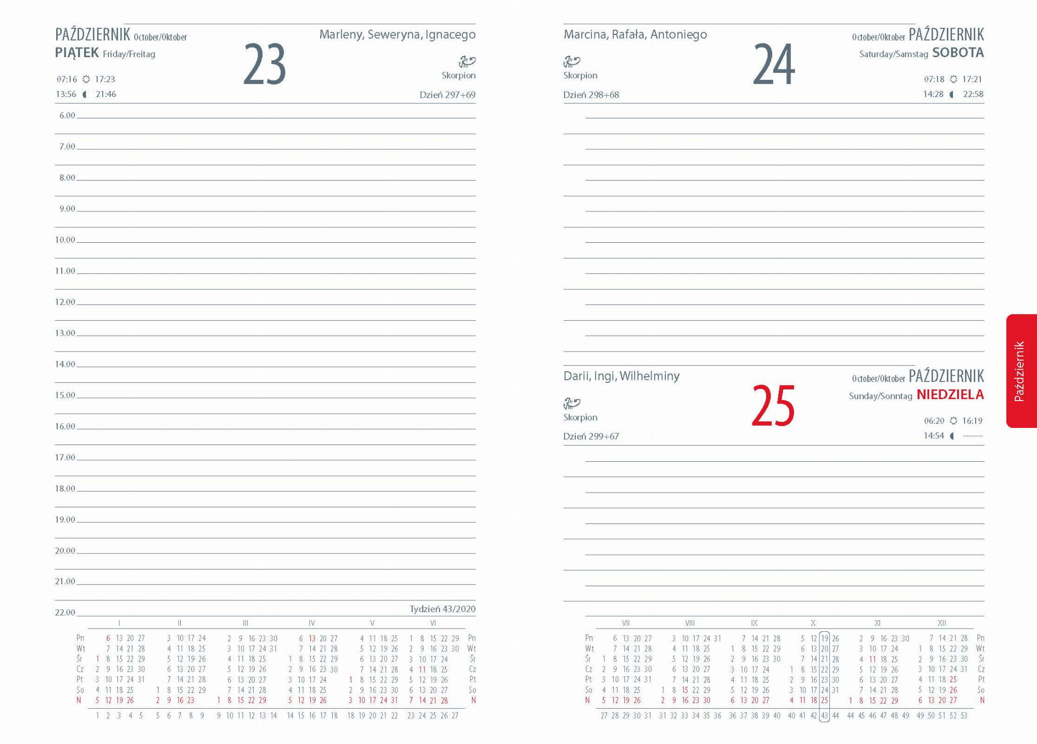 Tydzień na sześciu stronach, sobota i niedziela na wspólnej stronie w układzie poziomym. Objętość 352 strony, papier offsetowy biały 70 g/m2, druk w dwóch kolorach (szary i bordowy), registry drukowane dwurzędowe.