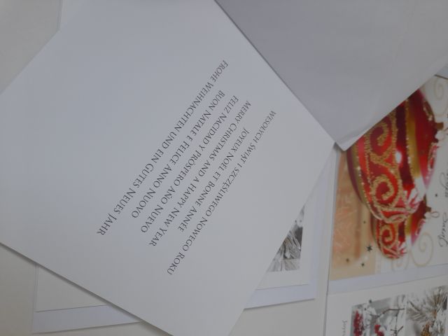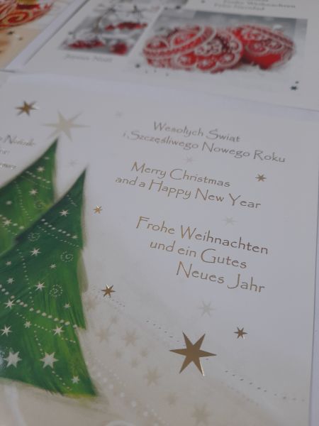 Piękny lakierowany i złocony karnet świąteczny. W środku życzenia w kilku językach, dołączona koperta.