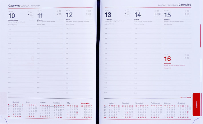 Układ tygodniowy, pomniejszony format A-4, perforowane narożniki, środek na białym papierze.