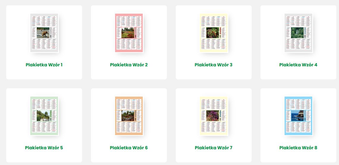Kalendarz formatu A4, z imionami i fazami Księżyca, drukowany na kartonie.