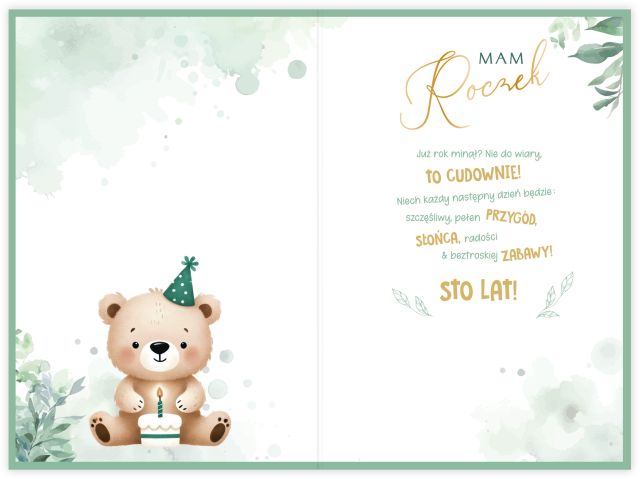 Subtelna i elegancka kartka urodzinowa B6, idealna na pierwsze urodziny. Wyróżnia się pastelową kolorystyką w odcieniach zieleni i złota, a jej główną ozdobą jest uroczy miś z tortem i świeczką, podkreślony przestrzennym efektem. Stylowe złocenia oraz akwarelowe roślinne detale nadają kartce wyjątkowego uroku, czyniąc ją doskonałym wyborem do sprzedaży w sklepach z artykułami okolicznościowymi.