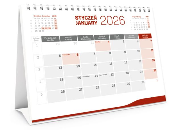 Cechy produktu: ✔ Układ miesięczny – dużo miejsca do notowania każdego dnia. ✔ Kalendarium w języku polskim i angielskim. ✔ Format kalendarium: 230x170 mm, format całego kalendarza: 230x190 mm. ✔ 12 stron – pełny rok w przejrzystej formie. ✔ Papier biały 70g/m², druk szaro–bordowy – klasyczny wygląd. ✔ Kartonowa podstawka z miejscem na nadruk reklamowy 220x13 mm. ✔ Opcja indywidualnej okładki – idealne rozwiązanie dla firm. ✔ Zaznaczone święta – praktyczna pomoc w planowaniu.