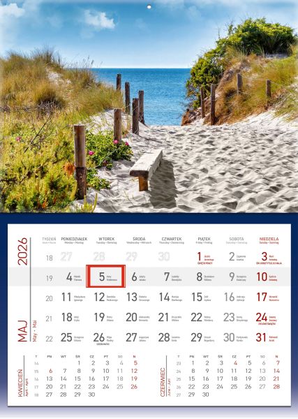 Model Wokół Nas Morze to bestseller w sprzedaży hurtowej. Łączy w sobie elegancję i funkcjonalność, a dzięki pięknym fotografiom morza przyciąga uwagę klientów. Doskonale sprawdzi się jako kalendarz do biura, a także jako nośnik reklamy firmowej.