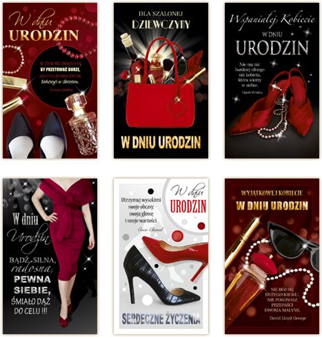 Ekskluzywna kolekcja laurek w formacie DL stworzona specjalnie z myślą o kobietach. Każda kartka zachwyca nowoczesnym, kobiecym designem – eleganckie szpilki, czerwone sukienki, torebki, perfumy i biżuteria nadają im szyku i wyjątkowości. Zdobione holograficzną folią i lakierem wybiórczym kartki pięknie się mienią, a kolorowe koperty i gotowe teksty życzeń sprawiają, że są od razu gotowe do wręczenia.