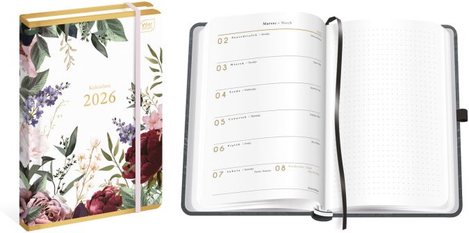 Format A5. Liczba stron: 192. Zaokrąglone rogi. Okładka z modnym metalicznym efektem. W środku kolorowa wyklejka. Twarda oprawa skutecznie chroni zawartość przed zniszczeniem, a elastyczna gumka utrzymuje luźne notatki na miejscu. Kalendarium w układzie 1 tydzień na stronie oraz część notesowa - kartki w kropki do notatek, planowania i rysowania. Wyposażony w praktyczne dodatki: tasiemkę do zaznaczania strony i pętelkę na długopis. W środku także: adresówka, praktyczne kalendarium oraz miejsce na dodatkowe notatki.