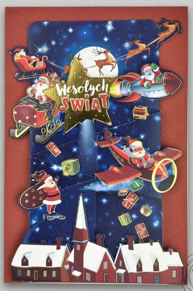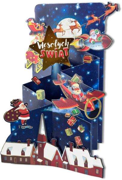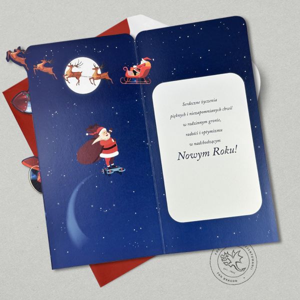 Zabawna, przestrzenna kartka świąteczna od marki Pan Dragon to prawdziwy hit sezonu! Pełna humoru i koloru scena z wesołymi Mikołajami lecącymi na saniach, rakiecie i samolocie wprowadza magiczny nastrój Bożego Narodzenia. Kartka po rozłożeniu tworzy efekt 3D, który zachwyca i bawi zarówno dzieci, jak i dorosłych.