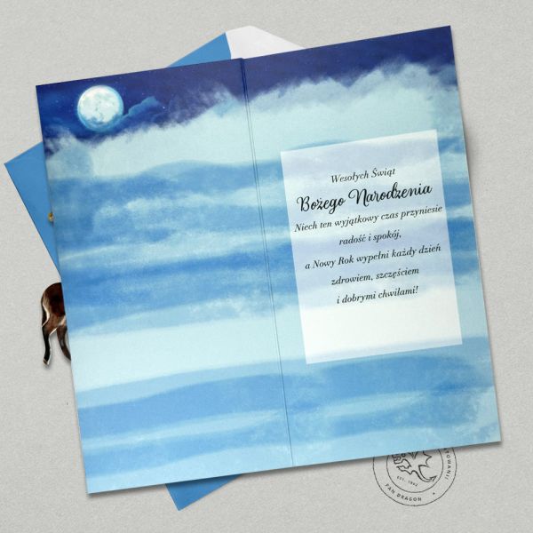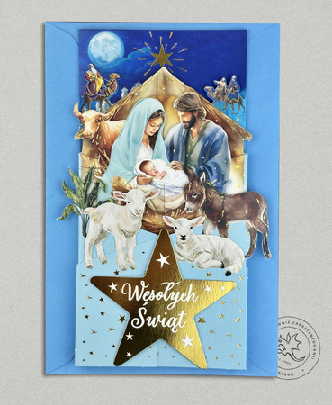Elegancka i nastrojowa kartka ¶wi±teczna Pan Dragon z trójwymiarow± scen± betlejemsk± to wyj±tkowy sposób na z³o¿enie ¶wi±tecznych ¿yczeñ. Przedstawia ¦wiêt± Rodzinê w stajence, otoczon± zwierzêtami i z³ot± gwiazd± z napisem „Weso³ych ¦wi±t”. Ca³o¶æ utrzymana jest w klasycznej, religijnej stylistyce z piêknymi detalami i delikatnymi z³oceniami, które nadaj± jej wyj±tkowego blasku.
