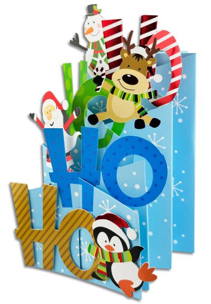 Rozwesel ¶wi±teczne dni kolorow± kartk± 3D od Pan Dragon! Weso³y Miko³aj, renifer, ba³wanek i pingwin tworz± radosny, zimowy korowód wokó³ du¿ych, trójwymiarowych liter „Ho Ho Ho”. Kartka po roz³o¿eniu zachwyca efektem przestrzennym, dziêki czemu idealnie nadaje siê równie¿ jako ¶wi±teczna ozdoba.