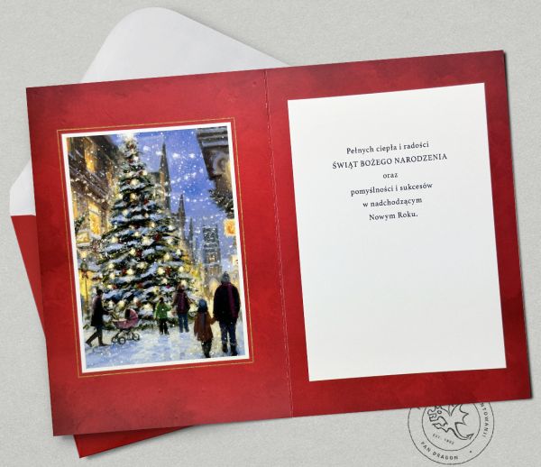 Pe³na magii i ciep³a kartka ¶wi±teczna z serii Star od PAN DRAGON przedstawia nastrojow±, zimow± uliczkê roz¶wietlon± blaskiem lampek i piêknie udekorowan± choink±. Scena rodzinna w sercu miasta idealnie oddaje klimat Bo¿ego Narodzenia – rado¶æ, blisko¶æ i magiê wspólnych chwil.