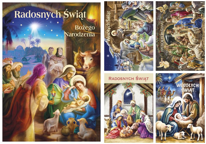 Tradycyjne kartki świąteczne POL-MAK w formacie B6B to kwintesencja świątecznego ciepła i religijnego przesłania. Każda kartka przedstawia piękne sceny Narodzenia Pańskiego – Świętą Rodzinę, Dzieciątko Jezus, Trzech Króli, pasterzy i zwierzęta w betlejemskiej stajence. Ciepła kolorystyka, dopracowane detale i nastrojowe oświetlenie tworzą wyjątkową atmosferę Bożego Narodzenia.