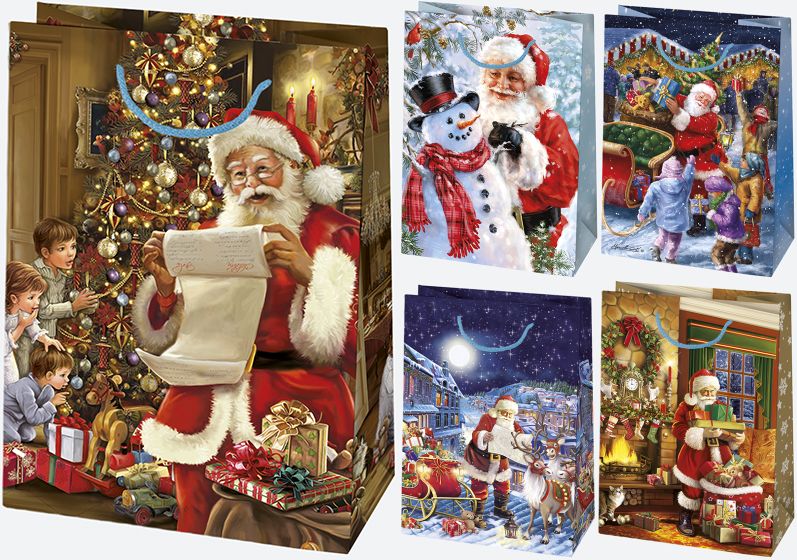 Torebki prezentowe POL-MAK z serii Gwiazdka T10_GW_18 to wyjątkowe, duże torby idealne na okazałe prezenty pod choinkę. Wzory przedstawiają Świętego Mikołaja w klasycznych, ciepłych sceneriach – przy choince, z listą prezentów, w saniach, a także w towarzystwie dzieci i bałwanków. Każda grafika tchnie świąteczną magią i radością. Torebki wykonane z grubego papieru kredowego o gramaturze 170 g/m² prezentują się elegancko i gwarantują trwałość nawet przy większych upominkach.