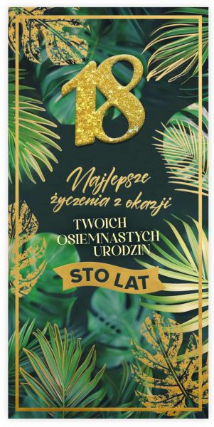 Stylowa i nowoczesna kartka od producenta Kartki z Kotkiem, stworzona z myślą o wyjątkowej okazji – osiemnaste urodziny! Na okładce króluje elegancka kompozycja zielonych liści i złotych akcentów, a błyszcząca cyfra 18 na gąbce dodaje kartce wyjątkowego, trójwymiarowego charakteru. Całość prezentuje się luksusowo i modnie – idealna zarówno dla niej, jak i dla niego.