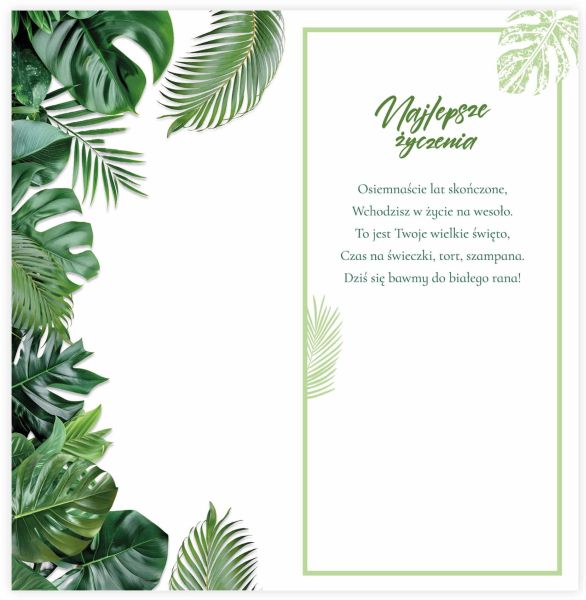 📦 Hurtownia kartek urodzinowych na 18 – Kartki z Kotkiem Ten tropikalny wzór z modnym motywem liści to hit sprzedażowy wśród kartek na osiemnastkę. Doskonały dla sklepów papierniczych, z prezentami i upominkami na specjalne okazje.