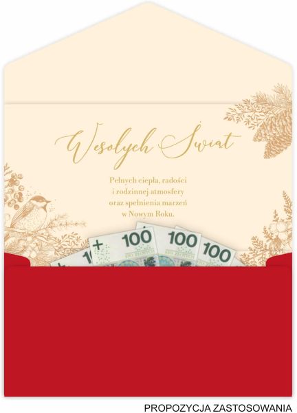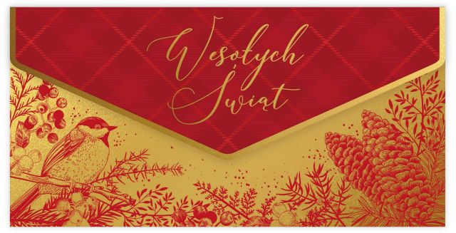 Wyjątkowo elegancka koperta świąteczna od producenta Kartki z Kotkiem, zaprojektowana z myślą o efektownym wręczaniu pieniędzy, bonów lub voucherów. Połączenie głębokiej czerwieni z złoconymi detalami i napisem „Wesołych Świąt” tworzy luksusowy i ponadczasowy design. Ozdobny motyw z ptaszkiem, szyszką i gałązkami iglastymi nadaje jej świątecznego, naturalnego uroku.