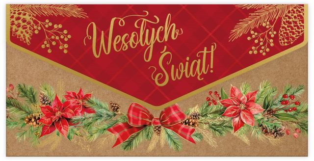 Stylowa koperta świąteczna od producenta Kartki z Kotkiem, zaprojektowana z myślą o eleganckim wręczaniu pieniędzy, bonów lub voucherów. Połączenie naturalnego, kraftowego tła z czerwonym motywem i złoconym napisem „Wesołych Świąt!” tworzy ciepłą, klasyczną kompozycję. Ozdobiona świąteczną gałązką, kokardą i kwiatami poinsecji – zachwyca zarówno kolorystyką, jak i jakością wykonania.