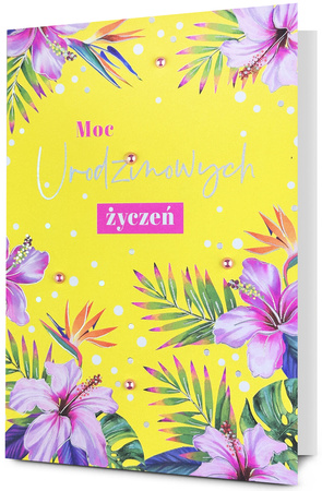 Kartka jest bogato i różnorodnie zdobiona (zależnie od wzoru: metaliczna folia, lakier perłowy, brokat, przyklejone elementy 3D - wypukłe wstawki papierowe, elementy biżuteryjne, tłoczenia). Kartka zawiera życzenia i kolorowy środek. W zestawie znajduje się koperta, kolorystycznie uzupełniająca się z kartką.