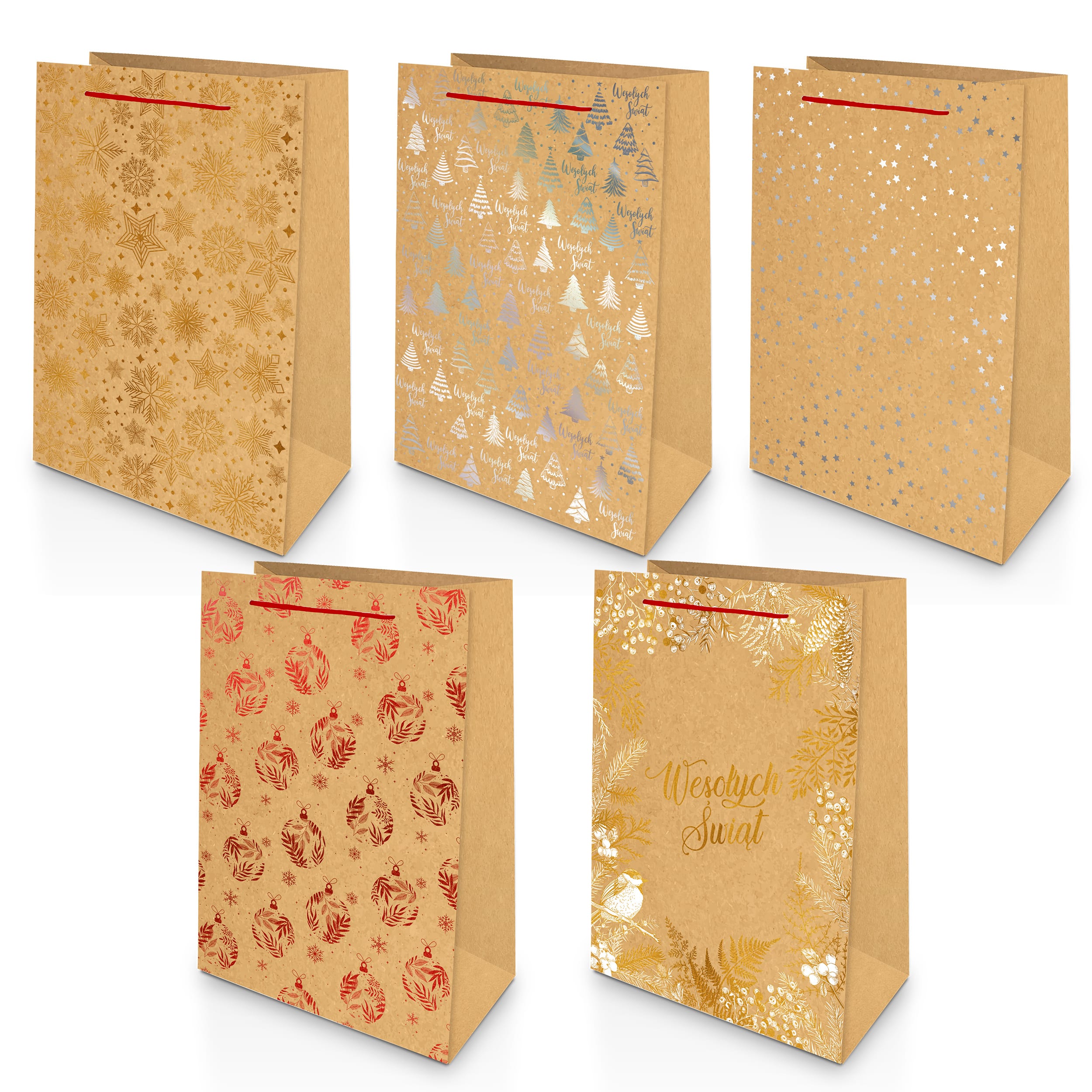 Cechy produktu: ✔ Zestaw 10szt. – mix 5 świątecznych wzorów. ✔ Zdobienia w kolorach: czerwonym, złotym i srebrno-opalizującym. ✔ Dwustronne złocenia i metalizowane ilustracje. ✔ Gruby papier kraft, odporny na zabrudzenia i zagniecenia. ✔ Wymiary: 233mm x 340mm x 99mm.