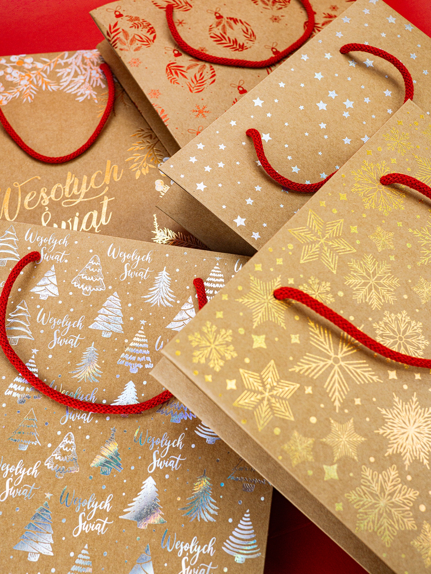 Wykonane z grubego papieru torby są trwałe, estetyczne i odporne na zagniecenia, dlatego świetnie sprawdzą się zarówno do domowych prezentów, jak i do pakowania bardziej wymagających zestawów świątecznych. Naturalna tonacja kraftu nadaje im przytulność, a połyskujące elementy – charakter premium.