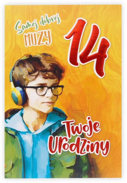 Idealna kartka dla 14-latka, który lubi muzykê, s³uchawki na uszach i klimat lekkiego, m³odzie¿owego chilloutu. Du¿a, t³oczona cyfra „14” w intensywnej czerwieni ¶wietnie kontrastuje z ciep³ym, pomarañczowym t³em. Ilustracja ch³opaka ze s³uchawkami nadaje kartce nowoczesny charakter, który dobrze trafia w gust nastolatków. W ¶rodku znajduj± siê kolorowe ¿yczenia, a w zestawie znajduje siê dopasowana koperta.
