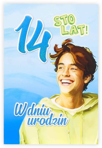 ¦wie¿a, pozytywna i pe³na luzu – idealna na 14. urodziny ch³opca, który lubi nowoczesny styl i jasne, pastelowe kolory. Du¿a, t³oczona cyfra „14” w ch³odnym odcieniu niebieskiego bardzo dobrze wyró¿nia siê na tle delikatnego, niebieskiego t³a. Ilustracja roze¶mianego nastolatka tworzy weso³y, przyjazny klimat. W ¶rodku kartki znajduj± siê gotowe, kolorowe ¿yczenia, a w zestawie znajduje siê dopasowana koperta.