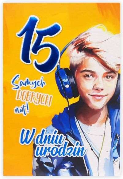 Idealna na 15. urodziny ch³opaka, który kocha muzykê, styl i dobry vibe. Du¿a, t³oczona cyfra „15” w intensywnym niebieskim odcieniu ¶wietnie kontrastuje z energetycznym, ¿ó³tym t³em. Ilustracja nastolatka w s³uchawkach nadaje kartce nowoczesny, modny charakter, który ¶wietnie trafia w gust piêtnastolatków. W ¶rodku znajduj± siê kolorowe ¿yczenia, a ca³o¶æ uzupe³nia dopasowana koperta.