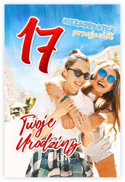 Cechy produktu: ✔ Tłoczona cyfra „17” – efektowna i wyrazista. ✔ Uszlachetnienia: złocenie oraz tłoczenie. ✔ Motyw przyjaźni – radosne, dziewczęce ujęcie, letnia atmosfera. ✔ Barwne życzenia wewnątrz. ✔ Koperta w komplecie. ✔ Format B6 – 13x19cm.
