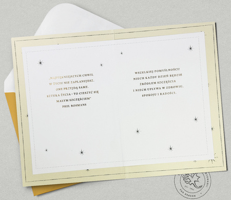 Kartka z okazji 90. urodzin to wyjątkowa propozycja dla uczczenia tego dostojnego jubileuszu. Złote zdobienia, ciemnogranatowe tło i rozbłyskujący motyw fajerwerków podkreślają wagę okazji, łącząc elegancję z podniosłą atmosferą. To idealny wybór na prezent dla babci, dziadka lub każdego bliskiego jubilata.