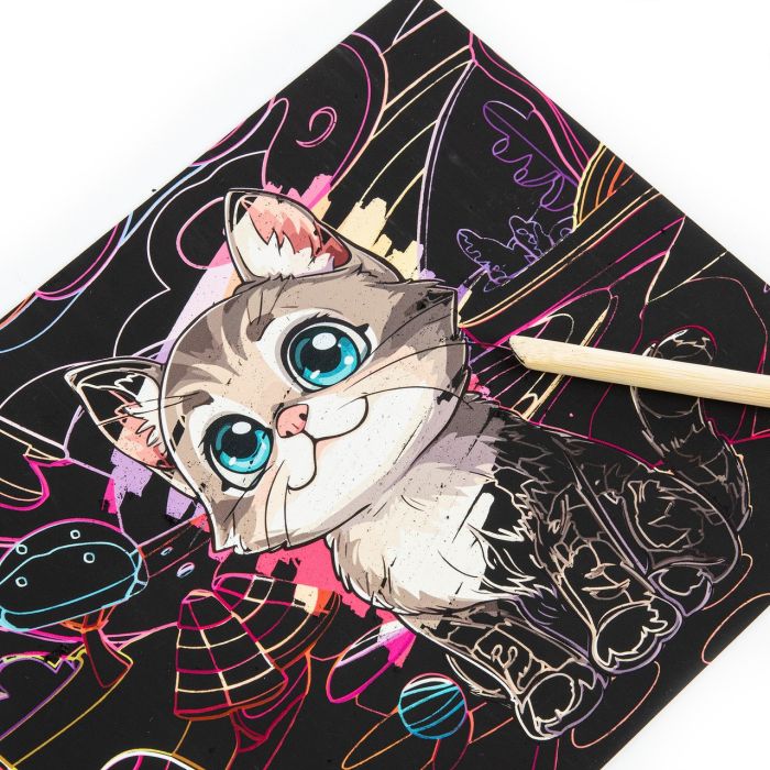 Wydrapywanka z kolorowanką Kidea. Niezastąpiony sposób na nudę dla dzieci w każdym wieku. Wystarczy za pomocą drewnianego rysika zdrapać czarną warstwę a po chwili ukażą się słodkie kotki. Po skończonej zabawie możemy obrócić kartkę i zacząć wypełniać kolorowankę.