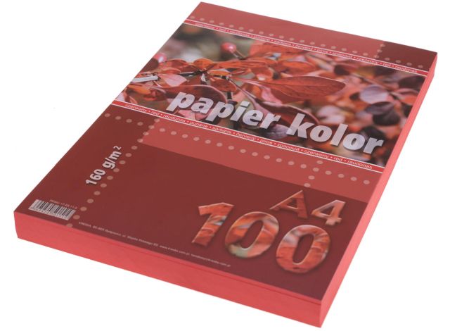 Papier ksero kolorowy A4 100k. 160g KRESKA czerwonyOpakowanie zawiera 100 arkuszy papieru barwionego w masie o gramaturze 160 g/m2. Format 210x297 mm. Produkt pakowany pojedynczo w folię termozgrzewalną. |