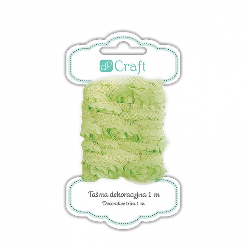 Taśma dekoracyjna DPCRAFT 1m - LimeDekoracyjna taśma w formie szyfonowych różyczek na tiulu.Doskonała do zdobienia projektów scrapbookingowych, kartek okolicznościowych, własnoręcznie tworzonej biżuterii, elementów garderoby itp.