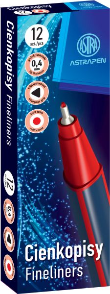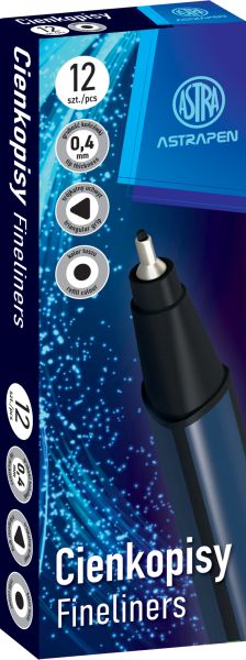 Cienkopisy trójkątne 0,4 mm ASTRAPEN - 18 szt.Cienkopisy trójkątne: • przeznaczone do pisania, rysowania i szkicowania • idealne do pracy z szablonami i linijkami • grubość końcówki: 0,4 mm • trójkątny przekrój |