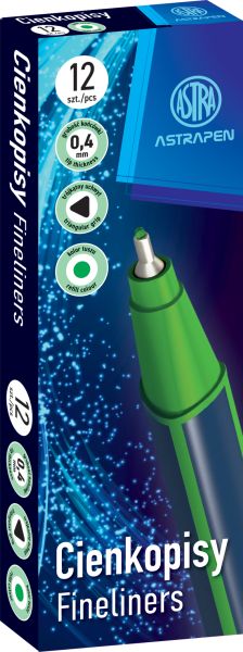 Cienkopis ASTRAPEN trójkątny - zielonyCienkopisy trójkątne: • przeznaczone do pisania, rysowania i szkicowania • idealne do pracy z szablonami i linijkami • grubość końcówki: 0,4 mm • trójkątny przekrój |