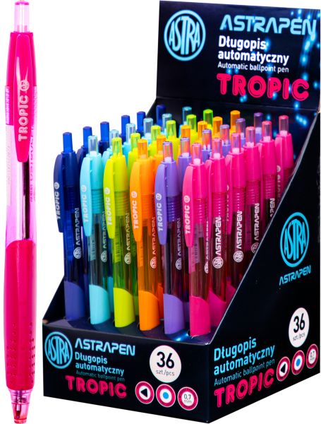Długopis automatyczny ASTRAPEN Tropic display• Długopis automatyczny • ergonomiczny uchwyt • grubość końcówki 0.7 mm • wyjątkowa lekkość pisania • niebieski kolor tuszu |