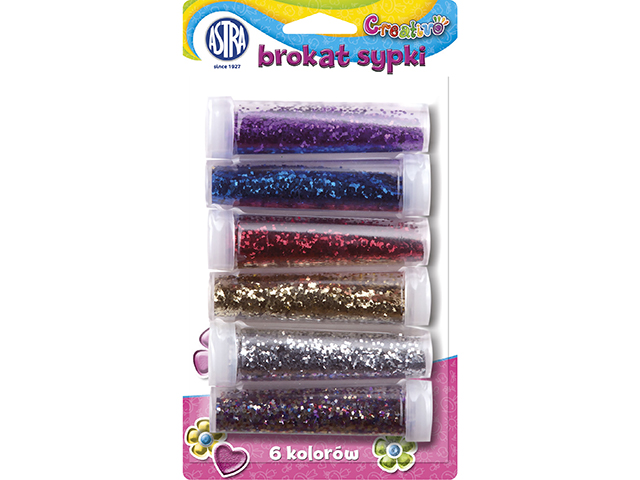 Brokat ASTRA 7g x 6 kolorów, blister•do dekoracji prac plastycznych, ozdób, papieru, scrapbookingu •do dekoracji przedmiotów z gliny, masy solnej •pojemniki z otworami uławiającymi dozowanie brokatu |