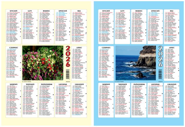 Kalendarium z imionami i bieżącą numeracją tygodni, drukowane na papierze offsetowym 70g/m2, 12 różnorodnych zdjęć do wyboru.