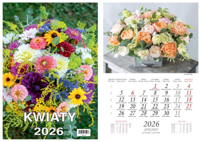 Kalendarz wieloplanszowy BESKIDY W04 13 zdjęciowy Kwiaty 2026Kalendarze z imionami i bieżącą numeracją tygodni drukowane na papierze kredowym, 13 zdjęciowe.