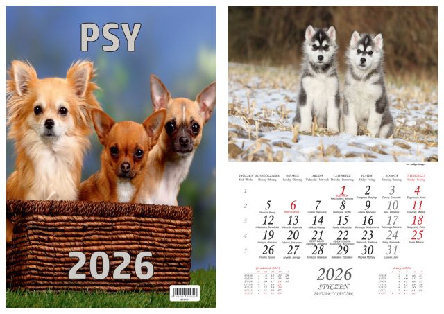 Kalendarz wieloplanszowy BESKIDY W07 13 zdjęciowy Psy 2026Kalendarze z imionami i bieżącą numeracją tygodni drukowane na papierze kredowym, 13 zdjęciowe.