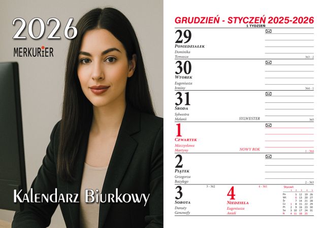 Kalendarz biurkowy BESKIDY B1 MERKURIER 2026Kalendarz stojący, okładka kolorowa drukowana na kredzie, kalendarium dwukolorowe drukowane na papierze offsetowym 70g/m2, stojak z białej tekturki.