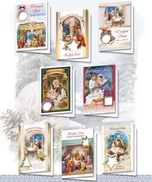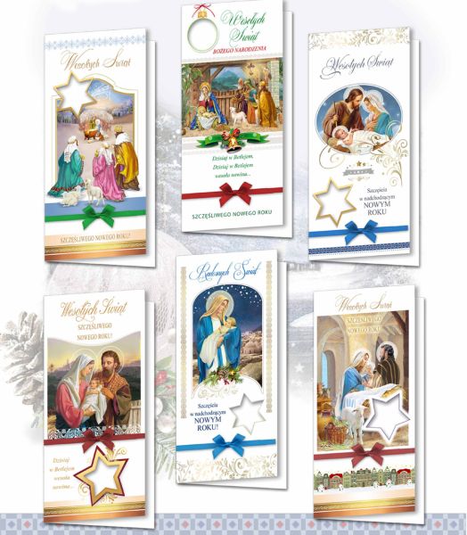 Kartki świąt. TOP B6 BWB religijneKarnet B6 (120x164 mm) brokatowany, ząbkowany na zewnątrz z kolorowym rewersem i życzeniami. Pakowany do folii wraz z kopertą w miksie seriami po 25 szt.