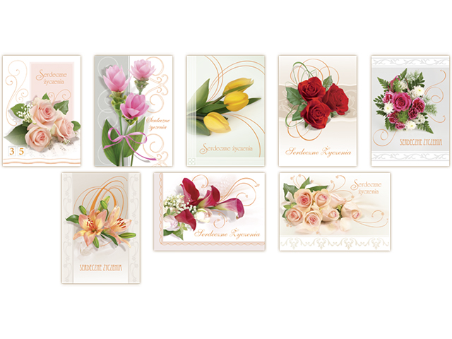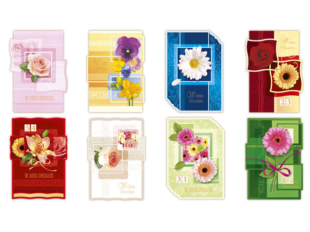 Laurki okolicznościowe format B6 Ozdobny wykrojnik, brokat, złocone napisy Kolorowe koperty W środku wydrukowany tekst życzeń