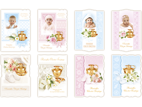 Laurki z okazji Chrztu Św. format B6 Ozdobny wykrojnik, brokat, złocone napisy, białe koperty W środku wydrukowany tekst życzeń z mottem i kompozycją graficzną