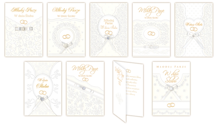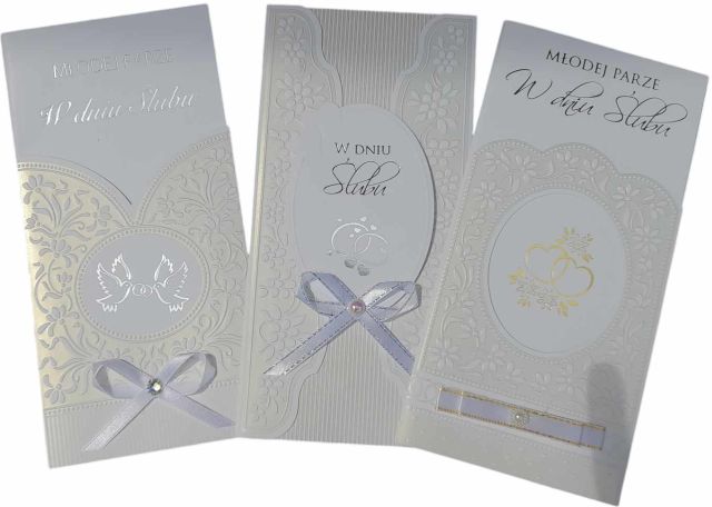Satynowy złocony lakier, tłoczenia. W środku tekst życzeń, białe koperty. Saszetki ozdabiane kokardką z dżetem lub perełką.