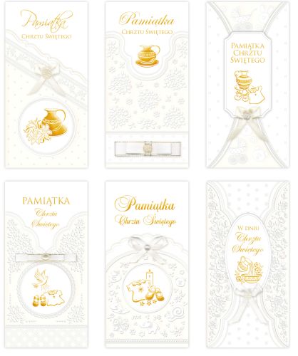 Laurka z okazji Chrztu Świętego format B6 w saszetce Satynowy lakier wybiórczy, tłoczenia, kompozycje ze złotej lub srebrnej folii, W środku tekst życzeń, białe koperty Saszetki ozdobione kokardką z dżetem lub perełką