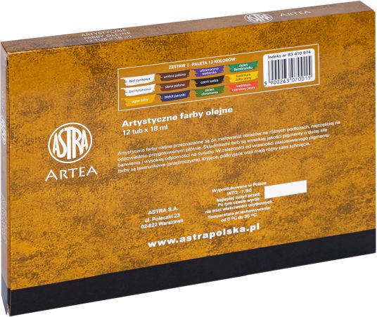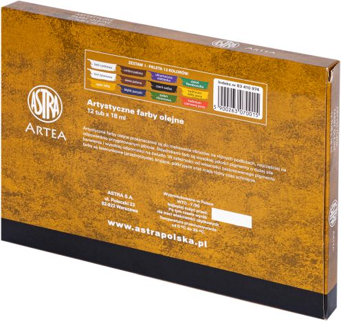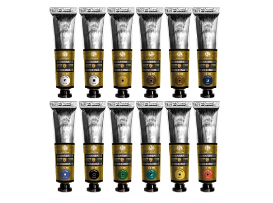 Głównymi składnikami farb olejnych artystycznych są wysokiej jakości pigmenty oraz olej schnący (olej lniany o odpowiedniej jakości). Zastosowane pigmenty mają dużą siłę barwienia i wysoką odporność na światło. Czas wysychania farb olejnych: od 2 do 30 dni w zależności od koloru.
