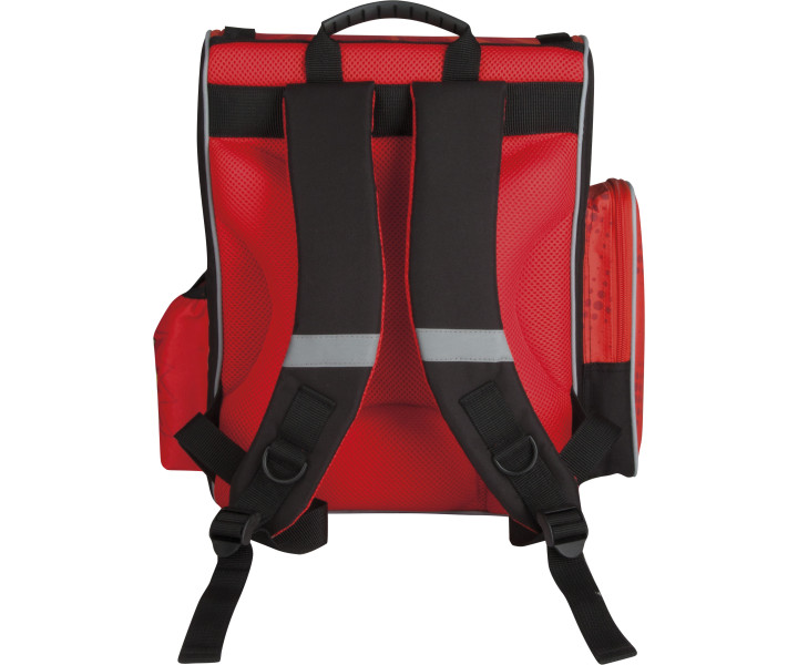 tornister posiada: usztywniony korpus, ergonomiczne plecy, miękkie szelki ze stabilizującymi paskami ramiennymi, pojemną komorę główną z przegródkami, kieszenie zewnętrzne, odblaskowe lamówki