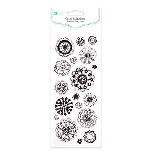 Naklejki do kolorowania – kwiaty. Doskonale sprawdzą się jako ozdoba papeterii, zeszytów szkolnych, kalendarza. Idealne w projektach wykonanych techniką cardmaking i scrapbooking. Fantastyczny upominek dla dużych i małych! Wielkim plusem jest ich nieduży rozmiar – kartka z naklejkami zmieści się między kartki książki, dzięki czemu można zabrać ze sobą kolorowankę w każdą podróż. Pokoloruj je swoimi ulubionymi kredkami, pisakami bądź długopisami żelowymi z brokatem, świetna zabawa gwarantowana!