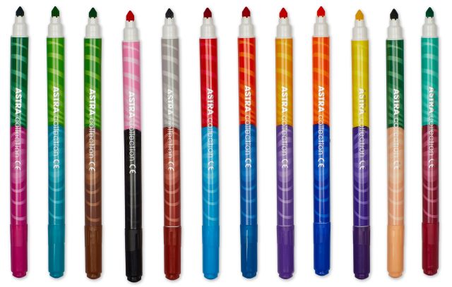 Flamastry dwustronne o intensywnych kolorach idealne do wszelkich prac plastycznych w szkole i przedszkolu. Wysokiej jakości tusz gwarantuje długą linię pisania. Zestaw 12 flamastrów to aż 24 różnorodne kolory, które pozwalają na nieograniczone możliwości artystyczne. Twórz piękne ilustracje i rysunki, koloruj i baw się!